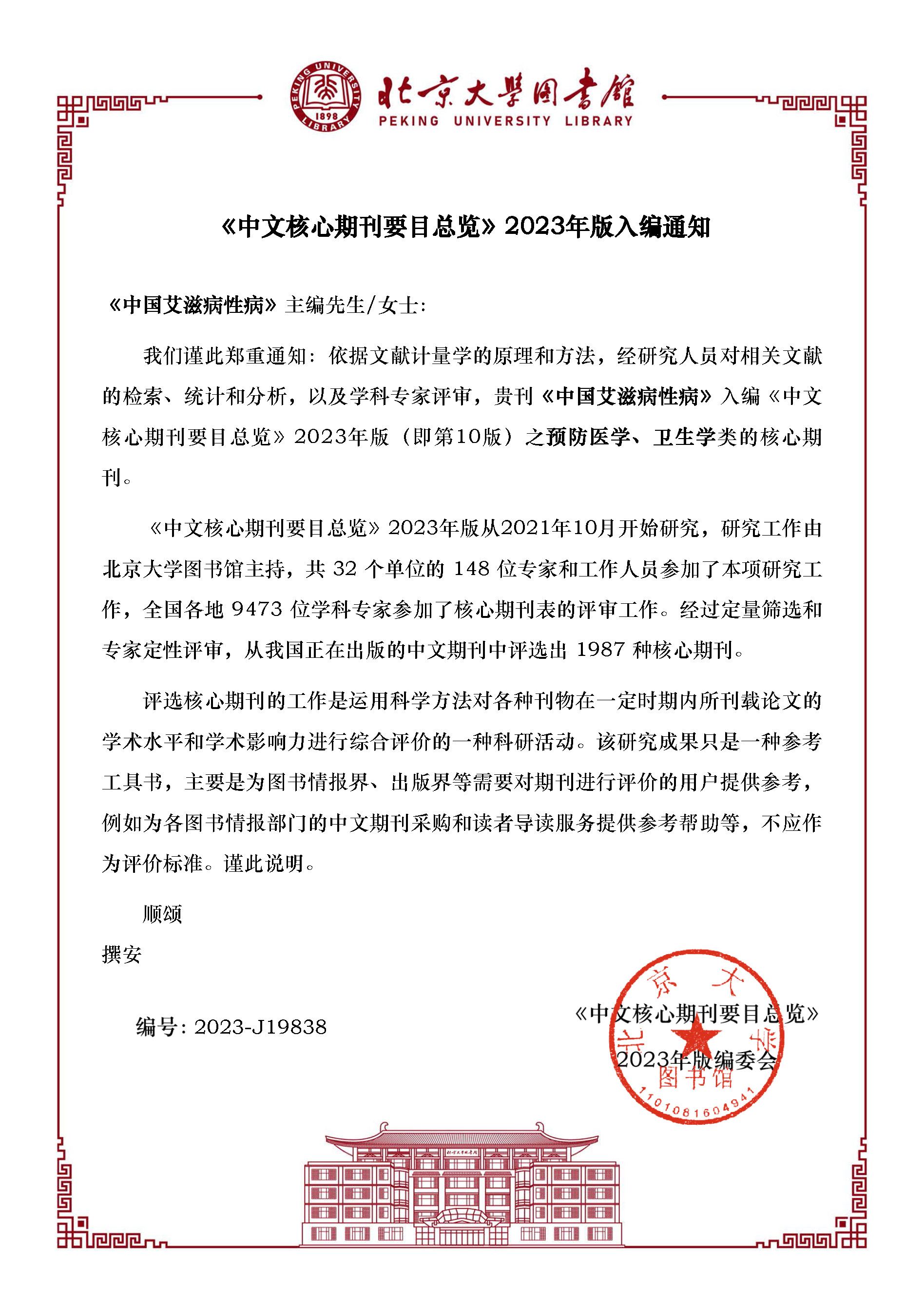 《中国艾滋病性病》入编《中文核心期刊要目总览》2023年版(即第10版)预防医学、卫生学类的核心期刊。